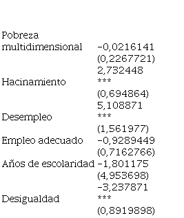 El modelo muestra que existe una influencia de tres variables (tabla 2). A mayor hacinamiento, mayor violencia medida por la tasa de homicidios. Se debe decir que los cantones de la Costa ecuatoriana presentan mayor hacinamiento. A pesar de que las provincias de la Amazonía tienen índices altos y su tasa de homicidios es significativamente más baja que la de las provincias del litoral, hay una distancia de tres puntos en promedio más alta que con las de la Sierra. El desempleo también constituye un factor significativo, con un coeficiente de 5,10 para la variable por cada punto de tasa de desempleo. Lo más interesante es que la desigualdad es inversamente proporcional a la violencia.