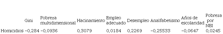 Esto podría deberse a que el coeficiente de Gini es más alto en las provincias de la Amazonía, cuya tasa de violencia es menor. Asimismo, Quito presenta uno de los Gini más altos del país, con una tasa de homicidios comparativamente baja. La desigualdad es relativamente más baja o similar a las de las provincias de la Sierra en las de la Costa, aunque la tasa de homicidios es considerablemente más baja. Al parecer, en el sentido esperado, la relación directa entre desigualdad y violencia no se cumple, para el caso ecuatoriano. De la misma manera, la pobreza multidimensional no tiene mayor impacto. Como podemos ver también en los coeficientes de correlación entre variables, la pobreza medida por necesidades básicas insatisfechas no es significativa. Esta variable no fue incluida en el modelo por la colinealidad que presenta con la pobreza multidimensional. En última instancia, miden cuestiones similares y puede ser reemplazada. Como se puede ver, también en los coeficientes de Pearson se presentan los datos como en el modelo.