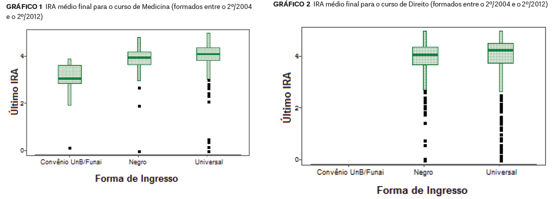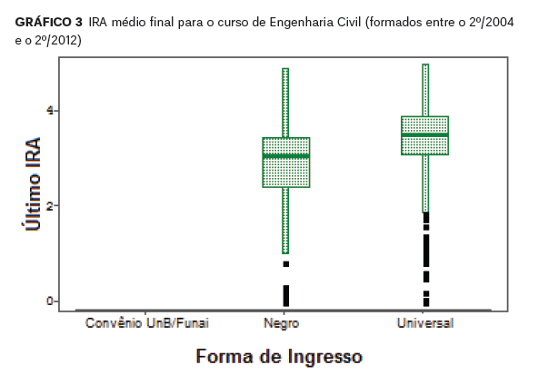 O relatório também compara o desempenho acadêmico de estudantes do sistema universal com estudantes do sistema de cotas. Para os cursos de Medicina e Direito, nota-se que o IRA (Índice de Rendimento Acadêmico) de ambos os grupos (excluído o convênio UNB/Funai) do sistema de cotas e universal são estatisticamente semelhantes com relação as medianas e variação. No caso do curso de Engenharia Civil é possível observar que o grupo do sistema de cotas obteve um IRA médio ligeiramente inferior ao grupo do sistema universal.