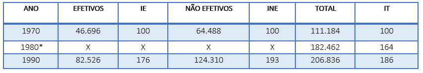 Apesar da precariedade de dados em relação ao período retratado, como aponta o autor, apresenta-se uma série histórica que permite “[...] avaliar, pelo menos tendencialmente, o contingente de professores que sustentam a política educacional” (RUS PERES, 1994, p. 116). Sendo assim, nota-se que no período entre 1970 e 1980 ocorreu um crescimento de 64% do número total de docentes, enquanto que no período total considerado (1970 – 1990) esse crescimento em média representa 86%, indicando que o maior percentual observado na tabela foi durante os primeiros dez anos. Os dados também assinalam especificamente a mesma tendência em relação aos efetivos, cujo aumento foi de 76%, e dos não efetivos 93% de crescimento.