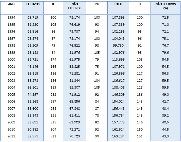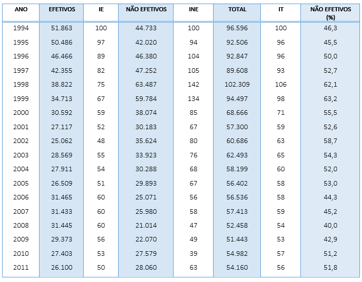 De acordo com os dados da tabela, observa-se a tendência de decréscimo gradativo do contingente total de professores no período considerado (1994-2011), principalmente a partir de 1999, finalizando com o valor de 44% em 2011, valor obtido subtraindo-se de 100 (ano base) o valor de 56% constante na tabela. Da redução total apurada, observa-se que a mais significativa se refere ao contingente de efetivos, (50%) em 2011.