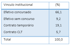 A tabela IV, apresentada a seguir, contém uma síntese da composição dos quadros docentes do ensino público no país, de acordo com o vínculo institucional mantido pelo professor com a escola.