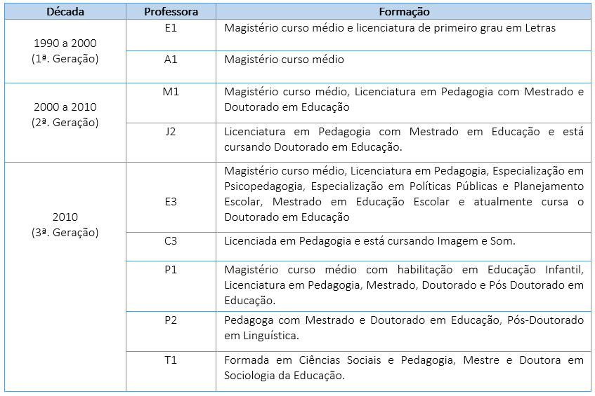 Observa-se por estes dados que a formação das docentes da primeira geração era bastante inicial. A falta de especificidade do trabalho com crianças pequenas na formação inicial destes docentes justifica a presença dos primeiros cursos de formação continuada em contexto apresentada neste presente artigo. Havia uma demanda emergencial em relação ao conhecimento julgado necessário na época para se trabalhar com crianças pequenas. A área da psicologia, por anos, predominou na educação por trazer conhecimentos específicos sobre a criança e seu desenvolvimento. O espanto, a dificuldade e os desafios de se trabalhar com crianças pequenas esteve muito presente na primeira geração de professores “Minha formação não tem nada a ver com a educação infantil. Em Rondônia atuei no ensino de 5 a 8ª série, então não imaginava como seria minha atuação com as crianças na educação infantil”. (Relato docente E2).