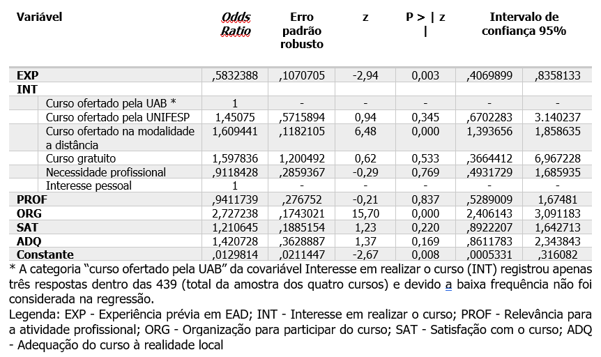 Os resultados obtidos na análise estatística inferencial confirmaram três dos parâmetros como preditores de sucesso nos cursos, como apresentado na Tabela 1: EXP se mostrou preditor de sucesso, reduzindo em 58% a chance de aprovação nos cursos; a categoria “Curso ofertado na modalidade a distância” do fator INT também se apresentou como preditor, aumentando em 1,6 a chance de sucesso; ORG mostrou-se preditor aumentando a chance de aprovação em 2,72.