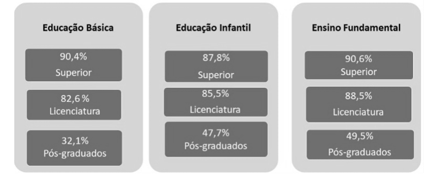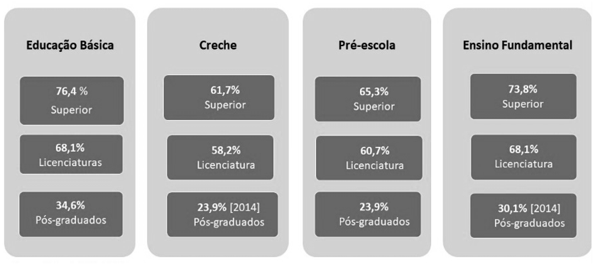 Um campo ainda em constituição em que a formação em nível médio ainda é aceita, vê-se o quanto a educação infantil necessita de um olhar mais atento por meio das políticas públicas, ainda que houvessem avanços, há um longo caminho a percorrer. Sobre a formação dos professores, dados do observatório do PNE apontam que em 2015, 76,4% dos professores da educação básica possuíam ensino superior, o objetivo que em 2024, 100% dos professores sejam graduados. Este cenário aponta para uma classe docente ainda em formação, ou sem formação.