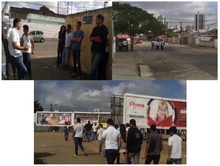A violência urbana é um dos principais problemas enfrentados no espaço das cidades, constituindo um dilema que, apesar de antigo, se faz presente com maior frequência na vida dos citadinos em tempos atuais. Com o objetivo de adentrar na questão prática da problemática já dita, foi realizado no bairro do Catolé uma aula de campo, usando como referência os principais sujeitos - os discentes. Os objetivos foram alcançados, apesar de algumas dispersões e falta de atenção iniciais, logo houve integração e aconteceram discussões e relatos acalorados sobre a relação que os alunos que moram no bairro do Catolé tiveram e ainda tem com a violência urbana. A Figura 2 apresenta algumas imagens da atividade desenvolvida.