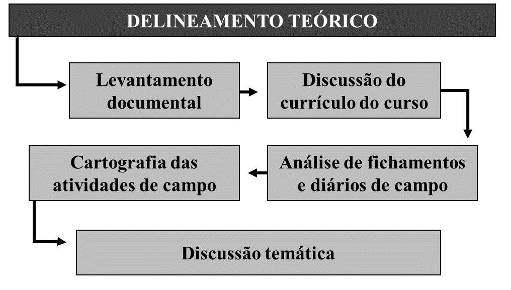 Como procedimentos metodológicos (Figura 1) são citados: levantamento teórico, bibliográfico e documental, para o delineamento teórico do estudo e embasamento documental; análise de relatórios de atividades de campo, principalmente fichamentos e diários de campo, possibilitando extrair uma maior quantidade de dados que possibilitam a discussão temática; e discussão temática quali-quantitativa, pautada, principalmente, pelos temas discutidos em cada atividade no que se refere ao contexto adotado.