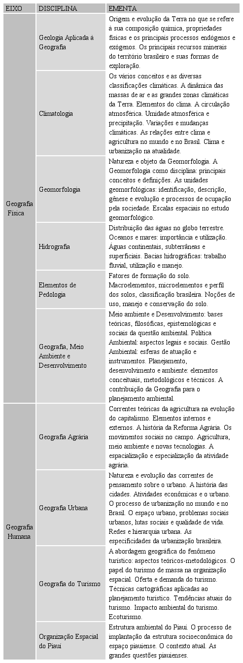 • Geografia Humana (disciplinas Geografia Agrária e Geografia Urbana, ambas do quarto bloco do curso, Geografia do Turismo e Organização Espacial do Piauí, respectivamente sétimo e oitavo blocos), não é, portanto, uma forma de dividir/fragmentar a ciência geográfica.