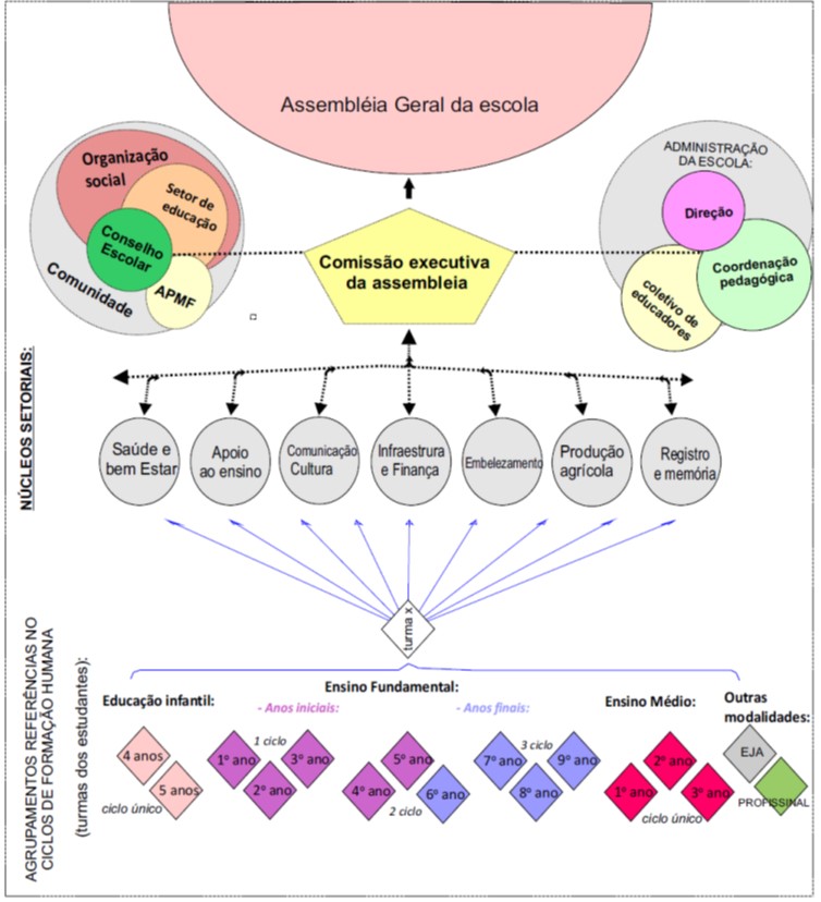 Conforme consta no Plano de Estudos, parte inferior da figura estão as turmas, dando sustentação ao todo, em atividades escolares regulares que vão se reagrupando de acordo com as necessidades que surgem. De tempos em tempos, os estudantes se revezam na participação junto aos Núcleos Setoriais [4], grupos de estudantes que se encarregam de trabalhos específicos da vida escolar. A Comissão Executiva é formada por estudantes-líderes dos Núcleos Setoriais. Junto com as Instâncias Colegiadas (representantes da comunidade, Conselho Escolar, APMF – Associação de pais, mestres e funcionários) e a Administração da escola (direção, corpo docente e coordenação pedagógica) convocam a Assembleia Geral da Escola (no alto da figura). A Assembleia Geral da Escola pode ser convocada no final do semestre ou extraordinariamente, se julgarem importante. Esses espaços de organização política são possibilidades formativas de organização coletiva. (MST, 2013).
