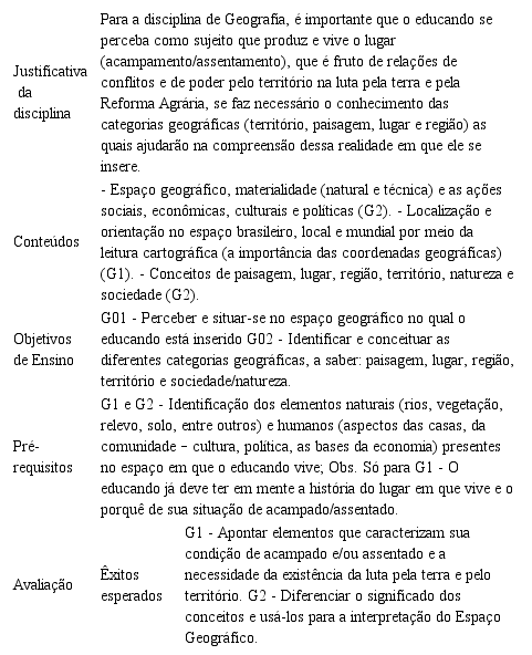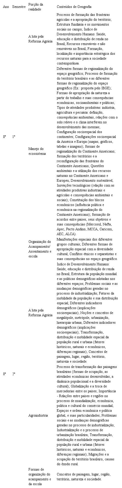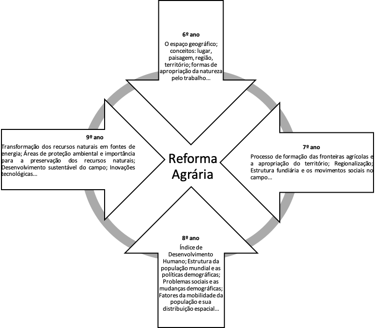 Desde a concepção de espaço geográfico, das formas de apropriação da natureza, das transformações nas paisagens, dos processos de regionalização, da formação de fronteiras até a presença de recursos naturais, os conteúdos vão, progressivamente, contribuindo para a apreensão do conceito de território com vistas à compreensão da Reforma Agrária.