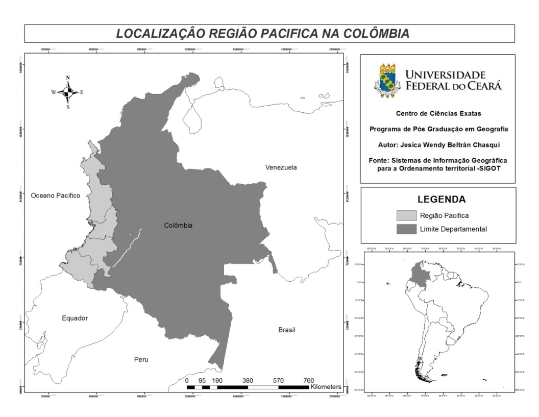 Os conceitos de Região e Paisagem serão discutidos no decorrer deste texto na medida em que se retratam no Pacifico colombiano, considerada como região por suas caraterísticas naturais próprias de floresta úmida tropical. Descrita comumente como uma região pobre, esquecida pelo Estado-Nação, habitada por grupos indígenas e negros, com inumeráveis rios e basta em recursos hídricos (ESCOBAR, 2010). Esta basta região se localiza ao sul oeste do país (ver Figura 1), contem uma historia de escravidão-exploração baseada na mineração de ouro, assim como de colonização, sendo o Pacífico em tempos coloniais o refúgio dos cimarrones [1], os quais se adaptaram as condições ambientais da floresta úmida tropical, adaptação que segundo Robert West em sua obra pioneira “Las Tierras bajas del Pacifico Colombiano” se deve à relação de convivência e intercambio cultural que existiu entre indígenas e negros, o qual permitiu um aprendizado por parte dos negros, sobre as forma de cultivo, de pesca, e até das formas de povoamento sobre o cursos dos rios (WEST, 2000).