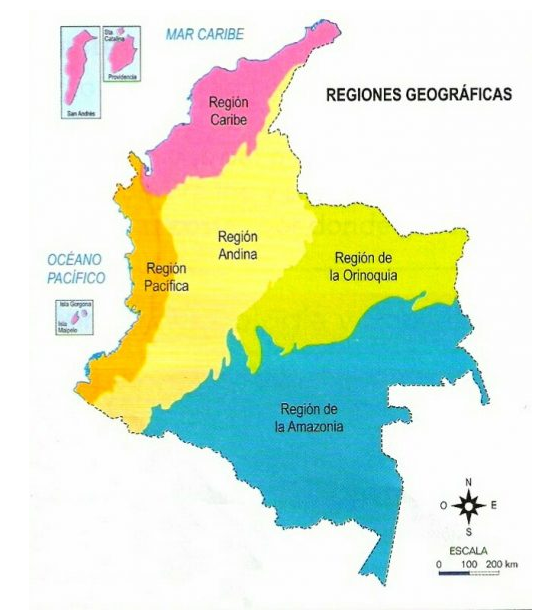 A Região como conceito tem sido ligada inicialmente aos elementos ambientais, obedecendo ao “conceito de região natural, nasce, pois, desta ideia de que o ambiente tem um certo domínio sobre a orientação do desenvolvimento da sociedade” (GOMES, 2010) ainda limitada aos elementos naturais e humanos, como meio estabilizador e diferenciador, assim o Pacifico por sua caraterística de floresta úmida tropical foi delimitada na Colômbia como região natural, junto com outras regiões naturais como a região Amazônica, Caribe, Andina, Orinoquia e Insular, cada uma caraterizada por seus elementos ambientais ecossistêmicos de vales, montanhas e florestas (ver Figura 2). Assim a Colômbia se tornou um país de Regiões, como afirma Fals Borda: