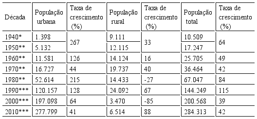 A partir da Tabela 1 é possível destacar alguns fatos: a) o município mais que quadruplicou sua população nas últimas quatro décadas; b) a população urbana ultrapassou a rural em 1980, resultado do êxodo rural; c) a taxa de crescimento urbano foi intensa desde anos 1940, atingindo 267% na década de 1940-1950 e 215% na década de 1970-1980; d) a taxa de crescimento da população urbana é muito superior a do município.
