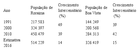 O histórico de crescimento populacional de Boa Vista se confunde com o de Roraima nas últimas décadas. Considerando que o estado foi constituído há 28 anos e aparece nas pesquisas de contagem populacional e censos a partir de 1991, é possível observar um crescimento intercensitário médio de 32% para ambos, sendo que os dois últimos censos demonstraram uma taxa de aumento demográfico de Boa Vista superior ao do estado.