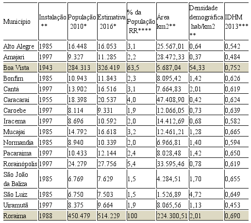 Em relação a Boa Vista, não se nota uma enorme disparidade em comparação aos outros municípios somente nos quesitos população, densidade demográfica, presença de estabelecimentos comerciais e atividades do setor privado. Olhando atentamente na tabela 5 o Índice de Desenvolvimento Humano Municipal - IDHM, que considera três quesitos como medida do grau de desenvolvimento humano, quais sejam: saúde (oportunidade de se levar uma vida longa e saudável), educação (ter acesso ao conhecimento) e renda (poder desfrutar de um padrão de vida digno), se extrai que Boa Vista, apesar de todas as mazelas geradas pelo crescimento da cidade de forma desigual e desordenado, que não oportuniza a todos os seus moradores as mesmas chances de acesso a produtos e serviços, programas e benefícios, está em melhores condições que os demais municípios roraimenses.
