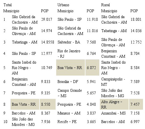 Boa Vista e Alto Alegre são os municípios com maior número de indígenas nas áreas urbana e rural do estado. Considerando a realidade nacional, Boa Vista ocupa o 8º lugar, com 8.550 indígenas – 71% em área urbana – 5% lugar com 6.072 indivíduos e Alto Alegre ocupa o 8º lugar em relação à população indígena em área rural do país – 7.457 (tabela 6). Isto significa que, em 2010, 3% da população boa-vistense se declarou indígena e destes, 2,13% estariam na área urbana da capital (IBGE, 2010). Por todo o exposto, “Boa Vista explicita uma espécie de síntese da sociedade e da realidade regional, propiciada pela pluralidade e diversidade de contatos, encontros e situações” (SOUZA, 2009, p. 41).