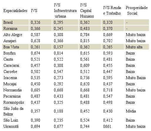 Outro indicativo de grande diferenciação entre a capital e os demais municípios de Roraima é o Atlas da Vulnerabilidade Social do Instituto de Pesquisa Econômica e Aplicada – Ipea, que a partir de metodologia própria calcula e fornece uma visão ampliada da exclusão e vulnerabilidade social dos municípios, estados e regiões metropolitanas brasileiras a partir de indicadores em três dimensões – infraestrutura urbana, capital humano e renda e trabalho.