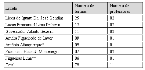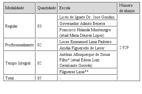 As escolas pesquisadas estão situadas na sede municipal de Iguatu, com exceção da Escola Francisco Holanda Montenegro localizada no Distrito de José de Alencar. As escolas estão divididas em ensino regular, profissionalizante e de tempo integral, além de um Centro de Educação de Jovens e Adultos (CEJA), este último não incluído na pesquisa por necessitar de análises diferenciadas em função do público e dos professores que atuam por área e não por disciplina. Vale ressaltar que a rede estadual de ensino no Estado do Ceará passa por uma migração de algumas escolas de ensino regular para o ensino integral, por isso, as 2 escolas de tempo integral pesquisadas ainda possuem turmas regulares remanescentes.