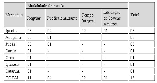 O município de Iguatu pertence a 16ª Coordenadoria Regional de Educação do Estado do Ceará (Crede 16) juntamente com outros 06 municípios abrangendo 18 escolas, as quais estão divididas em 04 modalidades diferentes: regular, profissionalizante, tempo integral e educação de jovens e adultos (Quadro 2).