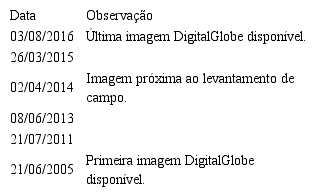 Por meio da ferramenta “Imagens Históricas” do GE foi possível identificar no período de junho de 2005 a agosto de 2016, um total de 18 imagens oriundas de diferentes satélites de alta resolução espacial da empresa DigitalGlobe. Considerando principalmente a qualidade visual apresentada, foram selecionadas para análise multitemporal seis imagens do GE apresentadas na Tabela 1.