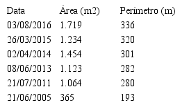 A Tabela 2 apresenta os resultados obtidos no monitoramento multitemporal da voçoroca entre os anos de 2005 e 2016. Estas medidas foram obtidas no GE ao adicionar um dado vetorial do tipo área (Polígono) com os limites da voçoroca no respectivo ano.