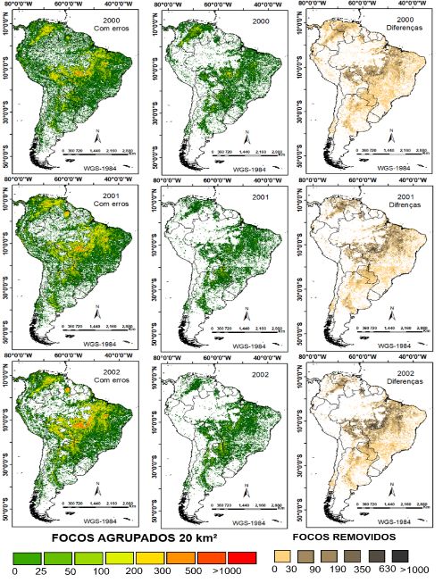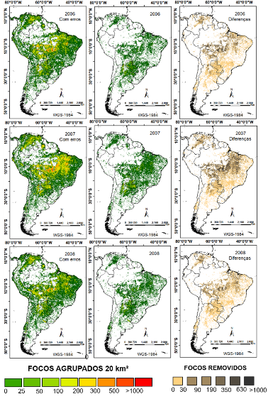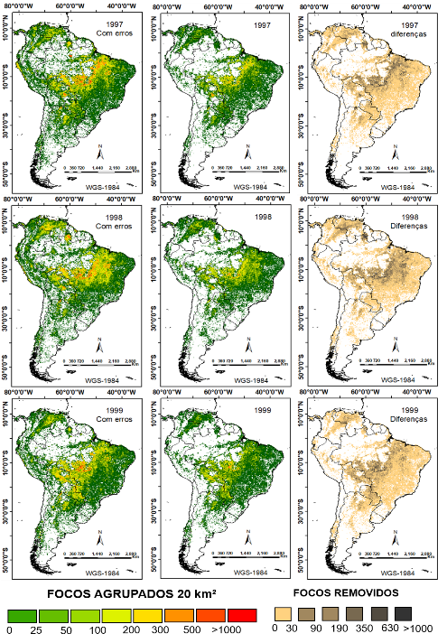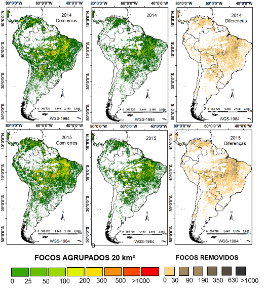 A distribuição espacial dos focos tornou-se fundamental para o entendimento sobre a localização e incidência das queimadas, e sobretudo sobre o impacto dos erros de detecção desses eventos ocorridos na América do Sul para os anos de 1997 a 2015.
