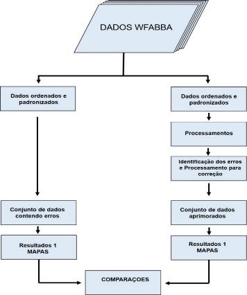 Para as atividades de processamento dos dados, inicialmente foi realizada a criação de um banco de dados dos produtos WFABBA, que são disponibilizados gratuitamente pela Universidade de Wisconsin - Madison (http://wfabba.ssec.wisc.edu) em formato American Standard for Computer Information Interchange (ASCII), que possibilita a leitura em editores de texto. Assim, na nomenclatura do arquivo em formato de texto, já é possível identificar o ano, dia (em formato de dia juliano) e hora da detecção.