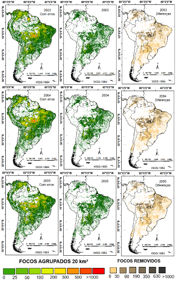A Figura 5 exibe os resultados obtidos após processamentos para os anos de 2003, 2004 e 2005. Assim como os outros anos analisados, ocorreu uma grande variação de número de focos removidos. Na primeira coluna de mapas, apresentando os dados sem correções, nota-se a detecção de até 500 focos por grade na região do arco de desmatamento, dados que, após correções, resultaram em um número aproximado de 200 a 300 focos por grade. Além disso, é possível observar que há uma incidência de focos de queimadas detectados na região noroeste da América do Sul, mais precisamente na Colômbia e Venezuela para os anos analisados, assim como uma significativa concentração de focos na região Centro Oeste, corroborando com dados disponibilizados pelo INPE que apontam o ano de 2004 com o maior índice da série histórica analisada, com resultado de 97019 focos ativos detectados.