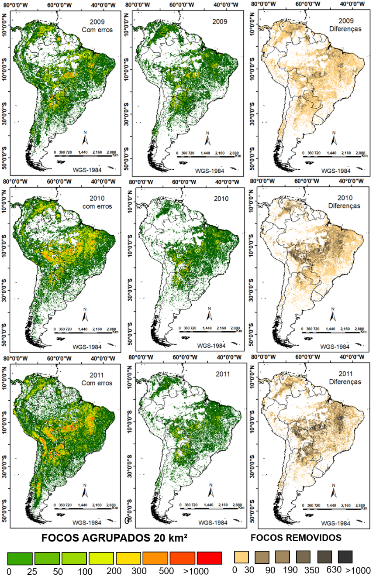 A Figura 7 mostra os mapas com a distribuição espacial dos focos de calor detectados pelo WFABBA após pré-processamentos, para os anos de 2009, 2010 e 2011. Para essa série temporal, percebe-se que os anos de 2009, 2010 e 2011, com informações anteriores à correção, apresentam um alto índice de focos detectados. Portanto, esses anos se diferem aos anteriores analisados em relação a quantidade, observa-se que no ano de 2010 a variação é significativa, ocorrendo grande concentração de focos superestimados na região central da América do Sul com uma acentuação na Bolívia e arco do desmatamento.