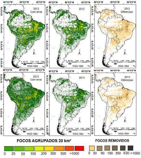O ano de 2011 foi um dos anos que mais se destacaram em relação à problemas de detecção. Em relação a todo processamento realizado durante a metodologia, foi o ano em que foram encontrados mais problemas de ruídos e falsos positivos de focos de calor. Os dados do produto WFABBA para o ano de 2011 continham leituras repetidas para um mesmo foco, que resultaram num grande arquivo, que para esse ano anteriormente à correção totalizou proximamente 86.000 arquivos. Percebe-se ao analisar o mapa de 2011, contendo os arquivos originais, que os focos agrupados em número maiores que 100 até 500 por grade estão presentes em várias regiões da América do Sul, como Paraguai, Argentina, Colômbia, Venezuela, Peru e principalmente Bolívia e região central do Brasil. A Figura 8 exibe os resultados dos mapas para os anos de 2012 e 2013.
