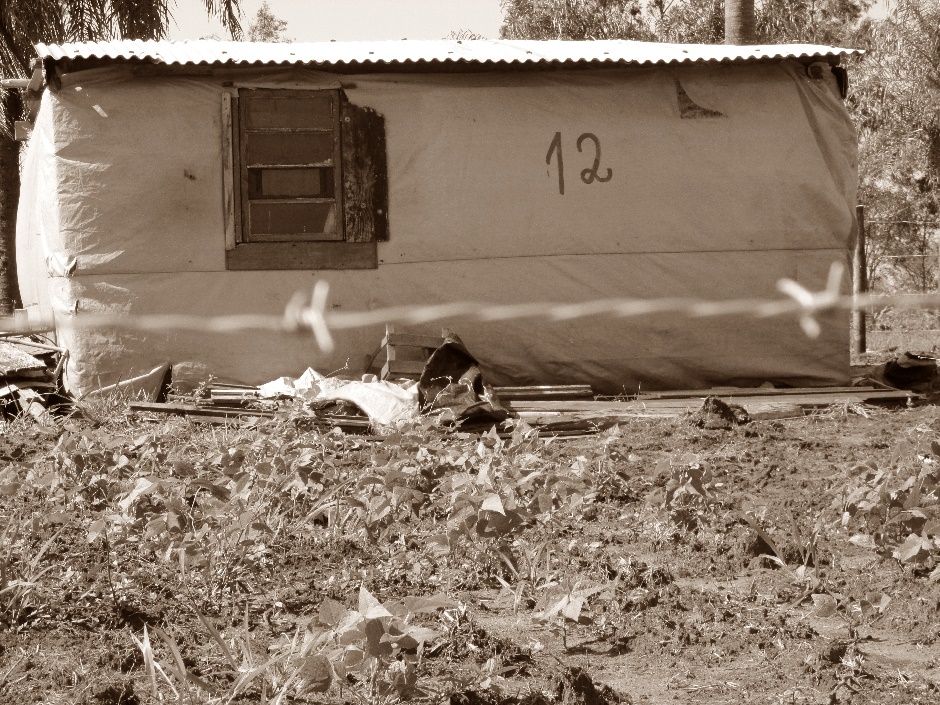 [...] eram constituídos de barracas feitas com pedaços de madeira e cobertas com um plástico denominado lona, na maioria das vezes de cor preta e em alguns casos amarela. Em todos os acampamentos era hasteada uma bandeira vermelha com o logotipo do movimento que o organizara, MST ou Fetape. As barracas cobertas de lona e a bandeira eram elementos distintivos e absolutamente recorrentes de todos os acampamentos.