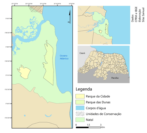 Os dois parques estão cercados por bairros densamente urbanizados. Ambos concentram resquício de Mata Atlântica e vegetação dunar. O Parque da Cidade apresenta menor expressão espacial e está na zona administrativa Oeste. O Parque das Dunas é maior em termos de área e possui limites com as zonas leste e sul, conforme a figura 1.