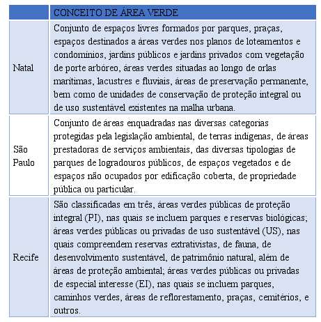 A classificação de áreas verdes para o Plano Diretor de Natal (2007) não se restringe apenas a praças frequentadas pelos cidadãos, todavia abrange orlas marítimas, áreas de preservação permanente, unidades de conservação, entre outros locais, que, apesar de alguns não serem utilizados diretamente pela população, prestam serviços ecossistêmicos, auxiliando no equilíbrio do ambiente. O mesmo se aplica ao conceito da Lei Nº 16.050 de São Paulo que integra, nessa definição, além das Áreas verdes, o sistema de Áreas Protegidas, áreas verdes e espaços livres, o qual os enquadra como áreas que necessitam de proteção pública para preservação. No conceito da Política de Uso e Ocupação do Solo de Recife (1996), também é vista uma abrangência no conceito, tendo em consideração que inclui cemitérios, reservas biológicas, entre outras áreas consideradas de proteção ambiental, assim como analisado também na conceituação de São Paulo.