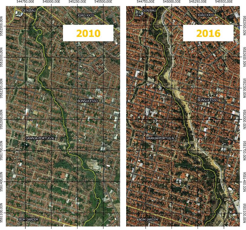 Os bairros Bonsucesso e Granja Portugal encontram-se presentes nos planos do TRECHO II, sendo considerado o trecho mais crítico devido ao elevado índice de uso e ocupação das margens do rio Maranguapinho, como os trabalhos ocorrem mutualmente sobre todos os trechos, o TRECHO II encontra-se com a margem direita com as obras bem avançadas, de forma que boa pare das indenizações e remoções já foram feitas, e o processo de urbanização/revitalização encontra-se bem avançado, entretanto a margem esquerda do TRECHO II praticamente ainda não iniciou as obras. Na Figura 6 é possível identificar bem esta situação juntamente com um comparativo entre os anos de 2010 e 2016. Observe, como já informado, que a margem direita é nítida as alterações que se seguiram a partir deste projeto de revitalização, entretanto a margem esquerda encontra-se praticamente intacta durante esses 6 anos.