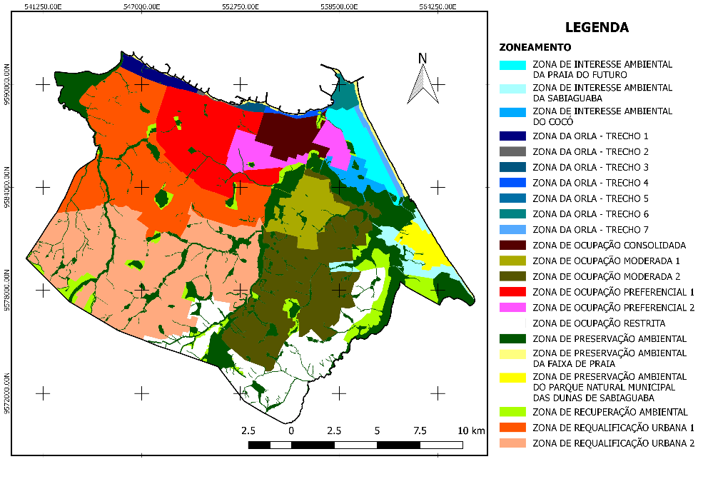 Para se analisar os riscos observados na área em estudo é preciso abordar o macrozoneamento de Fortaleza, mais precisamente o que se refere à Zona de Preservação Ambiental – ZPA. Essa e outras zonas são delimitas a partir da Lei Complementar Nº 236 de 11 de agosto de 2017 que regula os processos de parcelamento, uso e ocupação do solo do município de Fortaleza, utilizando-se e atualizando o Macrozoneamento contido no plano diretor participativo de Fortaleza – PDPFOR. Para melhor compreensão deste macrozoneamento observe o que se mostra na Figura 7 abaixo onde se delimitou todas as Zonas e suas localizações em Fortaleza, dentre elas a Zona de Preservação Ambiental que delimita as áreas que devem ter os recursos hídricos e ecossistemas preservados, deste modo, toda a extensão do rio Maranguapinho encontra-se dentro desta ZPA, fazendo parte da ZPA 1, destinada à faixa de preservação permanente dos recursos hídricos.