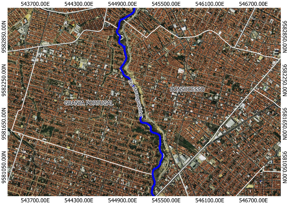 Os bairros Bonsucesso e Granja Portugal se localizam na região oeste da cidade de Fortaleza, capital do estado do Ceará, ambos são considerados bairros periféricos com elevados índices de criminalidade e baixo índice de desenvolvimento humano – IDH. Como principal área ambiental esses bairros possuem o rio Maranguapinho que também caracteriza a divisa entre eles, sendo considerado um dos principais rios que se encontram na cidade. Com aproximadamente 48 km de extensão o rio Maranguapinho nasce na serra de Maranguape e percorre 4 cidades da região metropolitana de Fortaleza, são elas: Maranguape, Maracanaú, Fortaleza e Caucaia onde ele desemboca no rio Ceará. Na Figura 1, é mostrado os bairros Bonsucesso e Granja Portugal com o rio Maranguapinho como divisa natural entre os bairros.