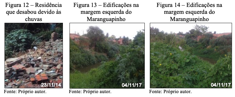 O terceiro risco identificado refere-se ao risco de desabamento/deslizamento das edificações. Devido aos longos períodos de estiagem nos últimos anos e da criação da barragem de contenção de cheias, as margens do Maranguapinho foram cada vez mais sendo ocupadas, muitas vezes a partir de processos de assoreamento do rio para posterior construção ou ampliação das edificações. Anualmente no período chuvoso em Fortaleza é comum a ocorrência desses desastres, periodicamente sai notícias relacionadas a este assunto na imprensa local. Em campo identificamos através de informações de populares uma residência que sofreu com esta situação, nas Figuras 12, 13 e 14 é possível observar os fatos aqui expostos.