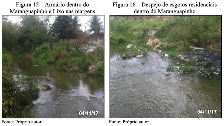 No que se refere a situações observadas dentro do leito do Maranguapinho, destaca-se a poluição do rio por resíduos sólidos oriundos de descarte irregular e o despejo de esgoto residências sem tratamento, transformando assim as águas do Maranguapinho totalmente impróprias para o consumo humano e de animais. Nas Figuras 15 e 16 é possível visualizar essas situações.