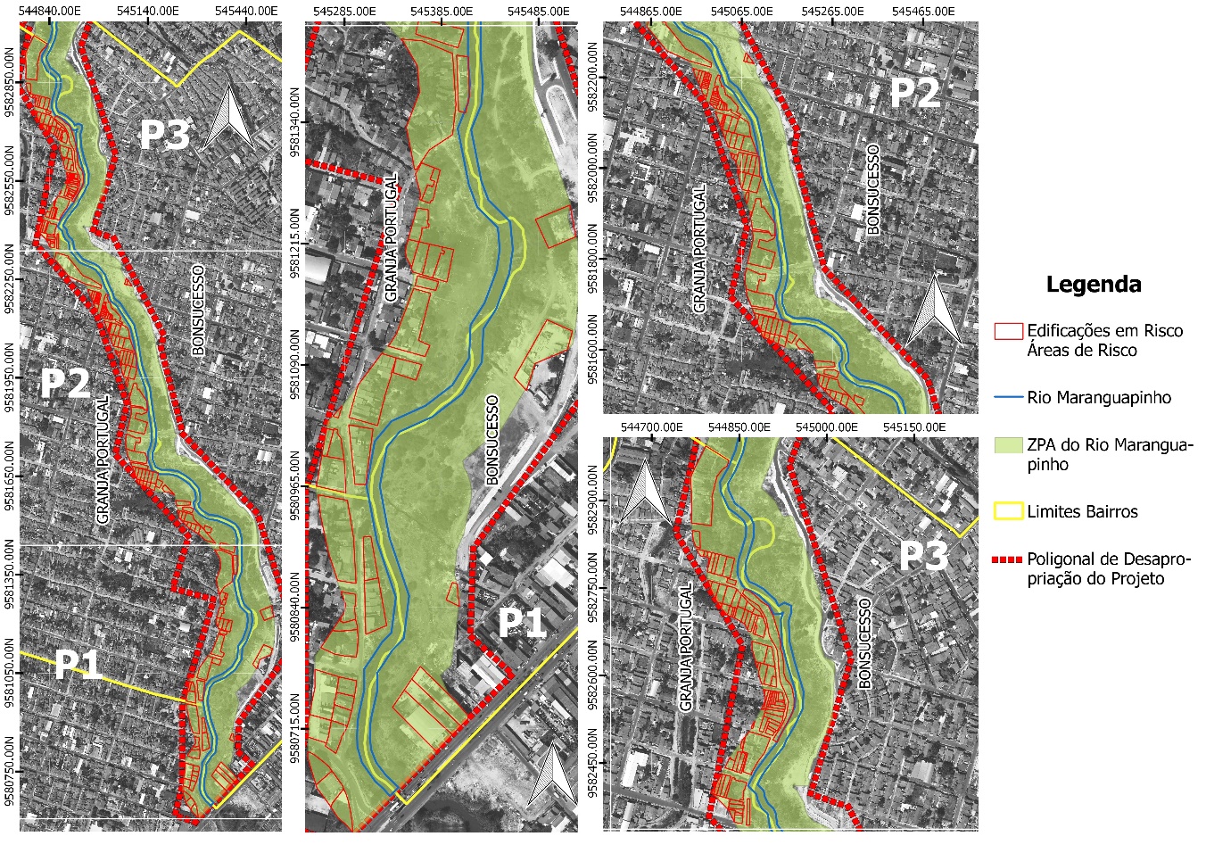A Figura 17 foi elaborada com objetivo de delimitar as áreas e edificações que se encontram dentro da APP e onde foi identificado algum tipo de risco aqui exposto, para tanto se utiliza a poligonal de desapropriação do projeto de revitalização do rio Maranguapinho, a delimitação da ZPA do rio, além de dados referente a poligonal cadastral da SEFIN. Assim a Figura 17 mostra a área em estudo dividida em três partes onde é possível identificar com detalhe aa situações anteriormente informadas.