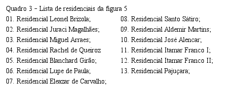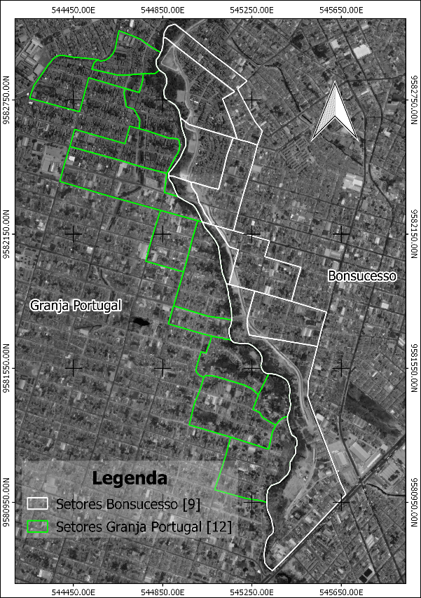 Fonte: Próprio autor.Partindo agora para os aspectos sociais os bairros Bonsucesso e Granja Portugal são considerados bairros periféricos de Fortaleza possuindo juntos 80.849 habitantes segundo dados demográficos obtidos pelo IBGE (2010). Ambos são bairros que cresceram de modo acelerado e que em alguns pontos esse crescimento urbano acabou passando os limites da convivência pacífica entre o meio natural e o urbano.