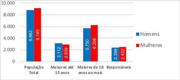 De modo geral, a população do nosso recorte espacial é formada por crianças e adolescentes de até 18 anos correspondia a 6.472 de um total de 18.007, ou seja, aproximadamente 35,7% da população é formada por crianças e adolescentes. O Gráfico 1 demonstra alguns dados populacionais referentes à faixa etária e o sexo.