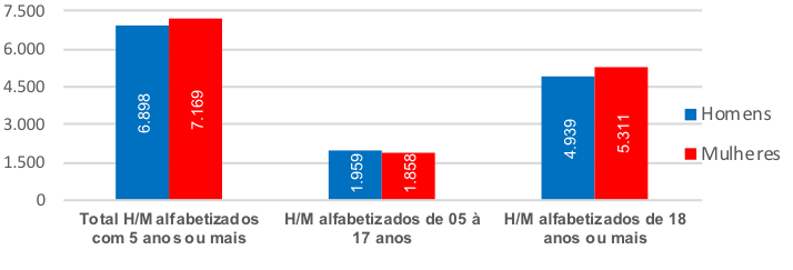 O total de escolas municipais a disposição desses bairros é um número bem razoável, sendo 21 escolas, já em relação a escolas estaduais apenas 1 encontra-se a disposição dos bairros. No Gráfico 2 são apresentados os dados de alfabetização por sexo e idade.