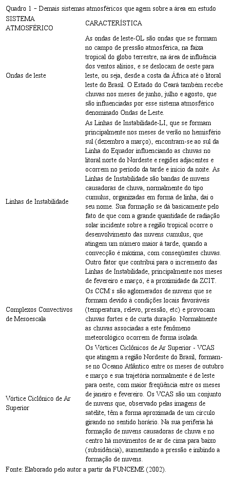 Os outros sistemas, por mais que não tenham a mesma influência que a ZCIT possui, também são de extrema importância para a dinâmica local, desta forma os caracterizamos no Quadro 1, a seguir: