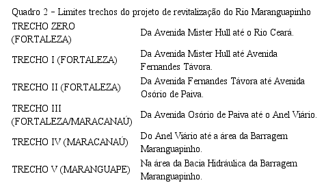 Como já informado anteriormente, o projeto de revitalização do rio Maranguapinho, encontra-se com os prazos inicias já vencidos, entretanto as obras estão em andamento e já é possível identificar alterações na paisagem pertencentes a área do projeto. Para melhor compreensão da divisão em trechos, e da criação dos 13 conjuntos habitacionais previstos para o reassentamento das famílias removidas dos locais de risco, observe o Quadro 2, Quadro 3 e a Figura 5 a seguir: