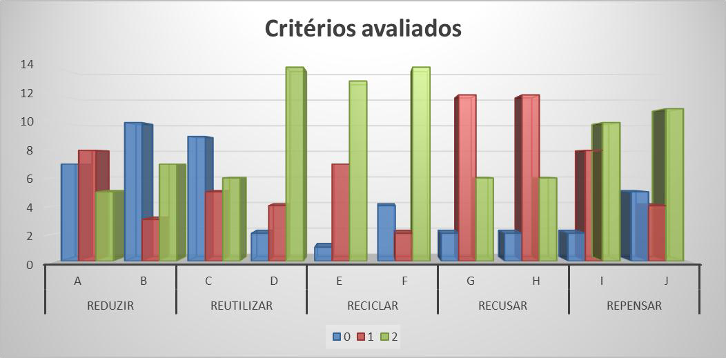 Recusar: a ação “Recuso folhetos de propaganda que não forem de meu interesse” obteve a frequência de 1, 2 e 0, evidenciando que a maioria as vezes recusam folhetos que não são do interesse dos mesmos, seguido em menor grau pelo grupo que quase sempre recusa a pegar material de propaganda que não lhe interessa. A ação “Evito empacotamentos desnecessários, levando ao supermercado ou feira a própria bolsa de compras” apresentou escalas idênticas a recusa de propagandas, sendo de 1,2 e 0 (figura 2). Essas escalas apontam para um comportamento ainda esporádico de recusar folhetos e empacotamentos desnecessários.
