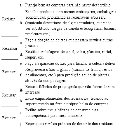 A sequência de aulas foi finalizada com uma discussão sobre o conceito de resíduo sólido, rejeito, com foco no significado da palavra lixo em nossa sociedade, assim como a importância de utilizar o termo correto, no caso resíduo, construindo um novo olhar para aquilo que até então era visto como algo sem uso ou possibilidade de reutilizar e/ou reciclar (MASSI, 2018).