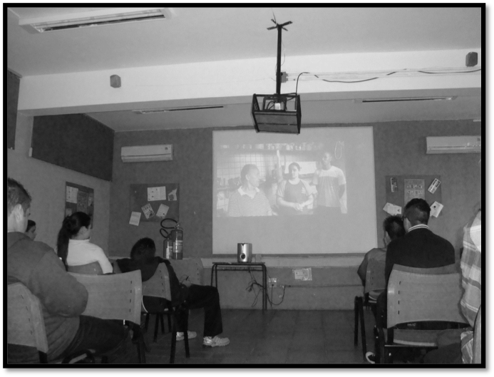 A técnica de vídeo é uma linguagem carregada de intencionalidade, com objetivos claros da problemática tratada e dos encaminhamentos necessários para levar a uma reflexão e um posicionamento diante do assunto tratado. Após um período de reflexão sobre os caminhos práticos a seguir, combinamos de filmar o depoimento do senhor Aparecido, funcionário da escola há mais de 20 anos, que é responsável por pequenos reparos e manutenções da unidade educacional. Ele era conhecido por poucos alunos. A maioria dos alunos não conhecia ao menos a localização da sala de ferramentas onde ele passa boa parte dos seus dias. Antes da gravação da entrevista, a equipe conversou sobre as possíveis questões que poderiam orientar a mesma. A filmagem se deu com apenas uma câmera e foi feita na sala de ferramentas. Os alunos fizeram as perguntas relativas a experiência do entrevistado ao longo de sua trajetória de trabalho no ambiente escolar, suas principais dificuldades e conquistas naquele espaço, além de sua rotina de trabalho, sem um roteiro fixo novas perguntas poderiam ser inseridas na medida em que surgiam novas informações e/ou pontos interessantes para serem aprofundados. Após a entrevista, o documentário foi editado e disponibilizado a toda a comunidade escolar, com o intuito de demonstrar a importância do trabalho desse profissional para manter a escola em condições adequadas e como a comunidade poderia ajudá-lo na construção de um ambiente ideal de estudos e vivências. A figura 3 mostra uma das sessões em que foi reproduzido o documentário para os alunos de outras séries apreciarem e conhecerem o trabalho realizado no colégio diariamente.