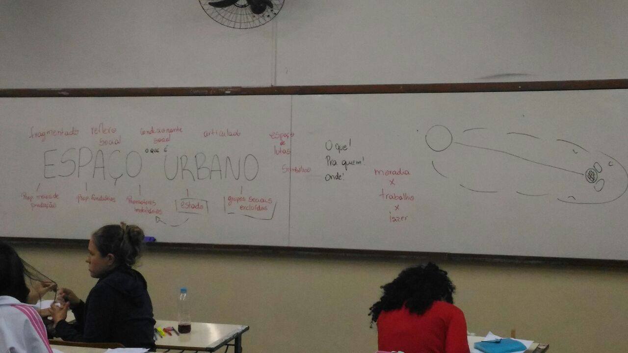 A primeira aula que planejamos como citado no capítulo anterior foi sobre o espaço urbano. Para ministrar tal temática foi pensando em trabalhar com a ideia de mapa conceitual no quadro (Figura 3), pois percebemos durante a observação, que os estudantes copiavam o conteúdo com mais frequência quanto este estava descrito no quadro. Partindo do princípio de buscar questionamentos e abordar o conteúdo a partir da vivência dos estudantes, escrevemos no quadro o tema “espaço urbano” e perguntamos a eles quais palavras ou conceitos vinham à mente quando liam essas palavras. Algumas palavras como cidade, prédio, estrada e outras, foram mencionadas em ambas as turmas, e a partir daí começamos o conteúdo. Tivemos certa dificuldade em explicar e simultaneamente escrever exemplos e conceitos no quadro, contudo, a ideia de realizar a aula através de um mapa conceitual auxiliou muito em relação a isso.