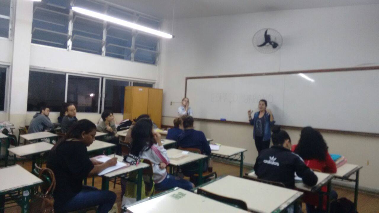 Power Point, com diversos mapas para relacionar os temas clima, relevo, vegetação e economia. Entretanto, experenciamos as dificuldades da docência, ao haver somente um computador para duas aulas que precisavam deste material no mesmo dia. Como era uma noite chuvosa e haviam poucos estudantes no início da aula, foi decidido que juntar-se-iam as turmas. A primeira aula iniciou, alguns estudantes foram chegando, tempos depois mais chegaram e por fim, quando chegou nossa aula (que era a segunda da noite), a sala estava complemente cheia, faltando até alguns lugares.