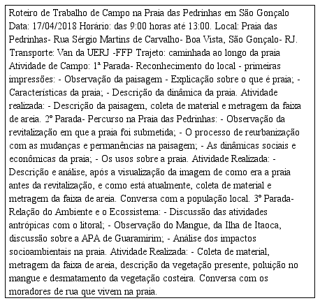 O trabalho de campo (TC) apresenta-se neste presente trabalho por meio da ida a Praia das Pedrinhas localizada no município de São Gonçalo-RJ, no bairro de Boavista, com o objetivo de provocar nos estudantes a compreensão espacial como um todo, ou seja, em sua totalidade dos aspectos litorâneos da cidade no qual estão inseridos. O trabalho de campo consistiu em três importantes paradas:
